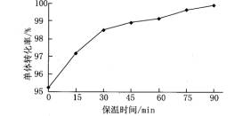 保温过程,使得残留的单体继续反应,熟化,以进一步提高转化率,降低最终产品的“臭味”。由图24可以看出,单体在刚开始保温时转化率就己经达到了95%左右,可见单体在滴加的过程中己经大部分参与了聚合反应。随着保温时间的延长,单体转化率进一步提高,当保温时间在1h以上时,单体转化率己经达到99.2%以上。因此,综合以上考虑, 保温时间控制在1