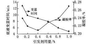 (2)引发剂用量对底液变蓝时间及凝胶率的影响引发剂用量对底液变蓝时间及凝胶率的影响结果见图2-6。