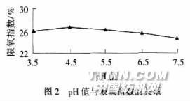 采用工艺A,在125℃下处理30min,阻燃剂20%,pH值对限氧指数的影响见图2.