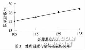 由图3可知,当处理温度在105~135℃时,随着处理温度的增加,限氧指数呈线性增加,限氧指数(y)与处理温度(x)