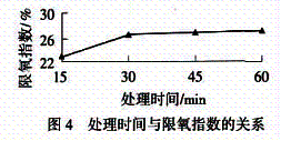 由图4可知,与未处理纤维相比,随着处理时间的延长,限氧指数值都有不同程度的增加,当处理30min 时,限氧指数增幅约29%,再延长时间,限氧指数增加很少,选用处理时间为30 min.