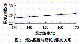 高温焙烘是让吸附在纤维表面的阻燃剂向纤维内部扩散,增强与纤维的结合牢度,提高阻燃纤维的耐久性.采用工艺B,在不同温度下焙烘2 min,焙烘温度对限氧指数的影响见图5.