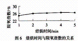 由图5可知,在130~170 ℃焙烘时,随着焙烘温度的升高,限氧指数呈线性增加,限氧指数(y)与焙烘温度(x)的关系为y(%)=0.046 x+18.54,相关度为0.9653.升温有利于涤纶纤维大分子链的运动、加速纤维表面的阻燃剂向纤维内部扩散和渗透,因此,水洗时阻燃剂不易从纤维上脱落,增加了阻燃剂在纤维上的固着量.当焙烘温度达到160 ℃时,限氧指数为26.0%,阻燃效果已较为良好,故选用160 ℃焙烘.在160 ℃下焙烘不同时间,焙烘时间对限氧指数的影响见图6.
