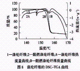 经阻燃处理涤纶纤维的热性能变化见图8.DSCTGA