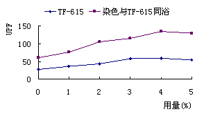 | 图4 TF-615不同用量对色差的影响 | 图5 TF-615不同用量对得色量的影响 |