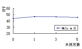 经过TF-615整理后的涤纶织物,采用AATCC-135标准,进行水洗。测定织物在经过多次水洗后的UPF值,从图6可以看出,织物有较好耐水洗效果。