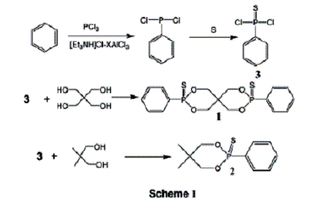 (2)(5,5-dimethyl-2-phenyl-2-thio-1,3,2-dioxaphosphorinane) (Scheme 1)。在硫代苯基膦酰二氯的合成中,使用离子液体法避免后处理中催化剂AlCl3无法除去的问题[14-15]。热性能研究结果表明化合物1具有良好的成炭性,是潜在的优良阻燃剂。
