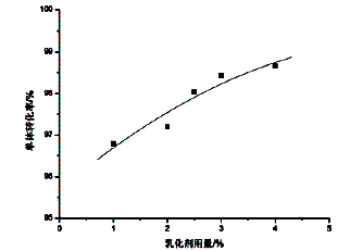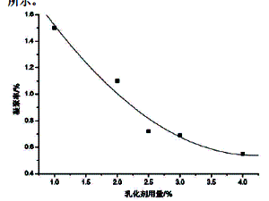 固定反应时间2.5h,反应温度80℃,引发剂用量0.5%,阴/非离子乳化剂配比为1:2,考察乳化剂用量的影响规律。其用量分别为:1.0%、2.0%、2.5%、3.0%,4.0%。实验结果如图2、图3所示。