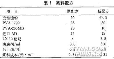 无机纳米浆料助剂早在多年前就已被日本、德国等发达国家成功应用在纺织上浆中,以代替PVA,降低浆料成本,提高织机效率。目前我国研制、生产无机纳米浆料助剂的企业也有多家,但质量参差不齐,价格也有天壤之别。通过比较,认为江苏射阳祥发化工有限公司生产的LX-10无机纳米浆料助剂以纳米二氧化钛为主要材料,具有储存稳定、使用前不需要高速搅拌、使用方便、价格适中等优点。在此基础上对LX-10无机纳米浆料助剂进行了系列上浆试验,为批量使用提供参考。1 织物规格 纯棉双层布,经纱号数14.6 tex,表纬号数14.6 tex,里纬号数58.3 tex,经纱密度637.8根/l0 cm,纬纱密度456.7根/lOcm,幅宽160 cm。2上浆实践 在新配方中使用LX-10无机纳米浆料助剂,与未使用纳米浆料助剂的原配方进行比较,并对在津田驹ZA205i型喷气织机上的织造效果进行跟踪分析。具体浆料配方、浆纱工艺参数、织造效果分别见表1、表2和表3。