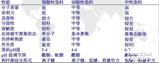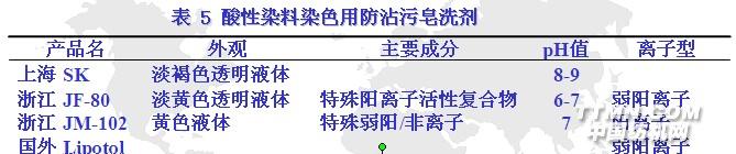 强酸性染料的分子质量较小,与纤维的亲和力低,直接性也小,染色时在纤维中易扩散和移染,故有良好的匀染性,但仅靠离子键与纤维结合,故色牢度不够理想。而弱酸性染料的分子质量较大,与纤维的亲和力较大,在染色时虽然较难扩散和移染,匀染性一般,但通过染色时添加助剂仍能达到良好的匀染效果,它与纤维不仅有离子键,还有氢键和范德华力结合,因此,色牢度好,可染深色,是常用的酸性染料。 酸性染料染色后也必须经过水洗,把染色时的各种助剂和未与纤维反应的染料去除掉,达到一定色牢度。因为弱酸性染料对纤维的亲和力相对较大,在洗涤时洗液中的染料很容易再回沾到纤维上,影响色牢度。例如:酸性大红F3GL、酸性红10B、酸性蓝6B、酸性艳蓝G、酸性湖蓝5GMA、酸性黑B、酸性黑BGL等较易沾色,尤其是红蓝系列染料,沾色后难以回修,因此,洗涤时一定要用防沾污皂洗剂。 由于酸性染料染色后的防沾污性能与活性染料染色后的防沾污性能完全不一样,因此,组成的防沾污皂洗剂也完全不一样,酸性染料是较强的阴离子型染料,只有利用阳离子表面活性剂较强的吸附作用,再复配高效分散剂,才能达到防沾污效果。常用于酸性染料染色后的防沾污皂洗剂参见表 5。