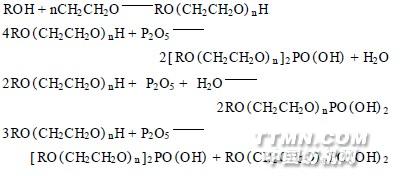 式中R 为C8 的烷基。 1.3 合成 1.3.1 脂肪醇聚氧乙烯醚的合成 向高压反应釜内投入一定配比的混合脂肪醇及催化剂氢氧化钾(占总量的013 %) ,开动搅拌,用氮气吹扫3 遍后升温至70 ℃,开动真空泵,真空脱水处理015 h ,关闭真空泵,升温至130 ℃,向反应釜内缓慢、连续压入定量环氧乙烷。进料过程中,保持反应压力小于014 MPa ,反应温度130~140 ℃。进料反应完毕,反应釜内压力降至0105 MPa 以下,保温平衡30 min ,降温出料,产物为混合脂肪醇聚氧乙烯醚。 11312 磷酸单酯的合成] 在装有搅拌器,温度计及冷凝管的250 mL 四口圆底烧瓶中加入脂肪醇,搅拌,低于50 ℃将P2O5在0.5~1.0 h 内分批加入。升温至7