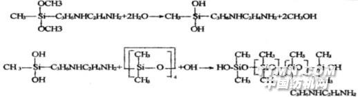 如果有六甲基二硅氧烷存在下就得到以甲基为端基的氨烷基聚硅氧烷。不黄变的偶联剂SB-702(γ-环已基氨丙基甲基二甲氧基硅烷)也以同样方法合成。N-β-氨乙基-γ-氨丙基三甲氧基硅烷(N2HC2H4NHC3H6Si(OCH3)3),偶联剂A-1120,γ-氨丙基-三乙氧基硅烷(N2HC3H6Si(OC2H5)3,偶联剂KH-550)及γ-(2,3-环氧)丙氧基丙基三甲氧基硅烷(偶联剂KH-560,CH2-CHCH20C3H6Si(OCH3)3)与D4反应得到氨基硅油是甲氧基或乙氧基为端基.它们都是三官能团偶联剂,不能进行本体聚合反应,但是可以进行乳液聚合反应,得到的产品为氨基硅油的乳液,具有很好的手感。