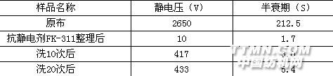 3 结果与讨论3.1 抗静电性涤纶织物原布、抗静电剂FK-311处理及水洗后的织物抗静电性能见表一。表一 抗静电剂FK-311测试数据