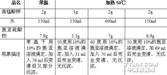 3、结论通过试验可以证明目前公司使用的高锰酸钾与焦亚完全反应的质量比为1:3.35,两种物质在常温下反应不是那么明