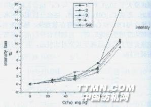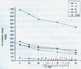图6各助剂在98℃不同时间下铁络合值图6各助剂在98℃不同时间下铁络合值由图5可见,各络合分散剂在一定的碱度及高温放置条件下,对碳酸钙的分散能力随着时间的增加均有所下降。这是因为,分散过程本身也是一种吸附过程,温度升高,使得络合分散剂与碳酸钙颗粒物之间的吸附减弱,分散能力降低。自制络合分散剂在高温下对碳酸钙的分散能力高于PAA,但低于其余对比含磷样品。 由图6可见,各络合分散剂在一定的碱度及高温放置条件下,随着时间的增加,对铁离子的络合能力均有所下降。但自制样品这种降低趋势不明显,在高温条件下对铁离子的络合性能基本与国产含磷样品持平。 3.3各络合分散剂对铁离子络合分散能力应用试验对比 按1.4.1对纯棉半制品织物进行复漂,添加不同计量的Fe3+于漂白液中,比较不同络合分散剂对Fe3+的络合分散能力、对漂白效果及对织物强力损伤的影响。