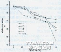 图7各助剂在不同铁浓度下复漂织物白度值