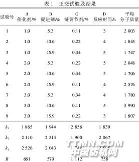 2结果与讨论 2.1聚合工艺正交试验 影响聚合反应的因素有催化剂及促进剂的用量、 链调节剂的用量、聚合温度和聚合反应时间等,考察 4个因素对聚合反应的影响,正交试验及结果见表1.