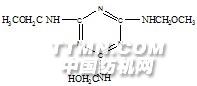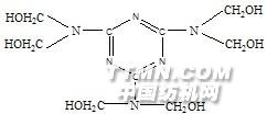 三聚氰胺很易和甲醛反应,非环氮原子上的氢原子被羟甲基取代,生成六羟甲基三聚氰胺,很大数量上用在“洗可穿”整理中。六羟甲基三聚氰胺树脂初缩体的稳定性较高,在中性水溶液中可保持数天,在织物上的整理效果持久性强,是棉织物使用的重要树脂整理剂。甲醚化羟基甲基三聚氰胺树脂MMM(Methoxy methylmelamine),是用甲醇进行醚化改性的羟甲基三聚氰胺树脂初缩体。甲醚化三羟基甲基三聚氰胺MTMM树脂,结构为: