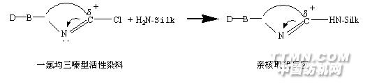 在酸性浴中,带有阴电荷的活性染料可与蚕丝纤维以离子键发生结合,这是酸性浴中活性染料上染蚕丝纤维的主要原因。在酸性条件下仍有氨基与蚕丝纤维的共价反应,但蚕丝纤维上的氨基含量很低(0.2摩 尔 / 千 克)[4],故酸性条件下的共价键合有限。 在碱性浴中染色,主要是蚕丝纤维上的氨基和羟基氧负离子与染料分子