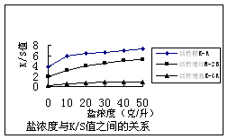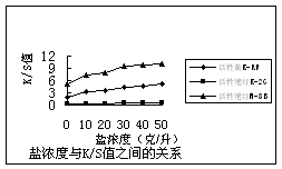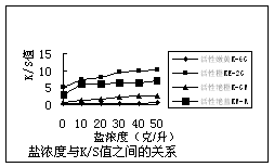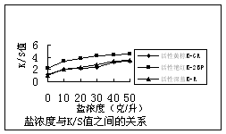 从盐浓度与K/S值之间的关系曲线可以看出:各染料染物的K/S值均随着盐浓度的增加而增大,但当盐浓度在