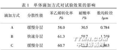 2结果与讨论2.1包囊化效果的影响因素 2.1.1单体苯乙烯与丙烯酸的滴加方式 在250 mL四口烧瓶中加入超细碳酸钙5.0 g,按 3种不同的滴加方式分别滴加引发剂0.11 g,苯乙烯+ 丙烯酸3.0 g,蒸馏水100 mL,在80℃和1 200 r/min转 速下恒温反应8 h.三种不同的滴加方式如下:A先将 全部单体(St+AA)加入到反应容器中,然后滴加用100 mL蒸馏水溶解的过硫酸铵;B先将100 mL蒸馏水溶 解的引发剂过硫酸铵全部加入到反应容器中,然后滴 加单体(St+AA);C先将100 mL蒸馏水全部加入到反 应容器中,然后滴加已溶解的(St+AA)-过硫酸铵混合 溶液.表1表明,三种滴定方式对单体苯乙烯的转化率 影响不大,而耐酸效果则是滴定方式B较A、C两种方 式好,从数均粒径和分散性能可得到印证.原因是在 滴定方式B中,首先加入的引发剂水溶液在CaCO3粉 末表面产生反应活性点,随聚合时间的延长,单体逐渐在CaCO3颗粒表面发生包囊化反应并逐渐对其产 生包覆作用,因此生成的颗粒粒径相对较大,由于重 力作用静置后很容易出现分层现象.