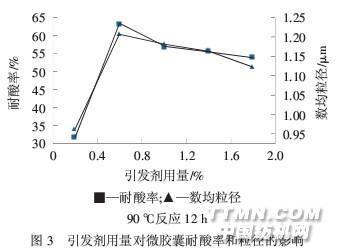 图2显示,随着聚合时间的延长,微胶囊粒径不断变大.包囊化12 h左右,耐酸率得到很大提高,颗粒 粒径增加较小,而12 h后,颗粒粒径增加很大,耐酸率 反而变化不明显.原因是反应初期生成的聚苯乙烯核 一方面吸收单体、引发剂和自由基在粒子相中聚合, 另一方面逐渐聚合在碳酸钙粒子表面,使包覆在碳酸 钙表面的聚苯乙烯膜厚度变大,形成的膜更致密,随着 聚合时间的延长,改性后的碳酸钙耐酸率逐渐提高.因 此,包囊化时间以12 h为宜.2.1.4引发剂用量由图3可看出,当引发剂用量过低时,单体转化 率很低,生成的聚合物对碳酸钙粒子的包覆率较低,表 现为碳酸钙粒子的耐酸率也较低;随着引发剂用量增 加,碳酸钙粒子的数均粒径增大,耐酸率升高,原因是 引发剂用量增加,自由基生成速率相应增大,数目增 多,粒子碰撞概率增多,转化率增大,引发剂用量为0.6% 时耐酸率最大;超过0.6%后,生成的自由基增多,会导 致生成的聚合物分子质量迅速下降,包覆后的碳酸钙 颗粒耐酸率有所降低.因此,引发剂用量应适宜,优化 引发剂过硫酸铵的用量为0.6%(对CaCO3质量).