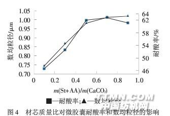 2.1.5材芯质量比[m(St+AA)/m(CaCO3)] 由图4可看出,随着m(St+AA)/m(CaCO3)的增加, 碳酸钙颗粒的耐酸率逐渐提高,而m(St+AA)/m(CaCO3) 超过0.7后,耐酸率有所下降.因为