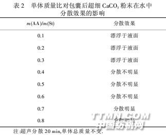 2.1.6单体丙烯酸与苯乙烯的质量比 从表2可知,当m(AA)/m(St)=0.4时,改性后的超 细CaCO3粉末在水相中形成悬浮分散液,均匀分散于 水相中.因为单体丙烯酸具有亲水性的羧基,而苯乙 烯是疏水性单体,在聚合过程中两种单体的质量比不 同,生成聚合物的亲水性羧基含量发生对应改变,随着 丙烯酸单体含量的提高,聚合物的亲水性有所提高. 在m(AA)/m(St)比值处于0.4~0.6时,改性后的CaCO3 悬浮分散在水相中,出现分层现象但不明显,说明此 时苯乙烯-丙烯酸共聚物的亲水亲油性处于相对平 衡状态,当m(AA)/m(St)大于0.6时,包覆层表面完全被 水润湿,提高了颗粒的润湿性,从而分散现象很明显.