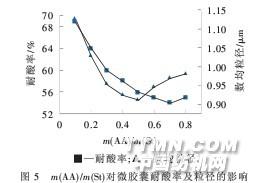 从图5可知,在m(AA)/m(St)=0.5时,数均粒径达 到最小,此时耐酸率在56%左右,比m(AA)/m(St)=0.1 时减少了13%左右[m(AA)/m(St)=0.1时,耐酸率为69%], 这进一步印证了在制备微胶囊囊壁过程中,单体苯乙 烯用量是影响耐酸率的主要因素,在单体总质量固定 时,m(AA)/m(St)比值增大,则苯乙烯用