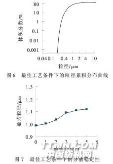 综合亲水性、分散效果、耐酸率、数均粒径考虑, 选择m(AA)/m(St)=0.5.2.2分散稳定性将最佳工艺条件下获得的粒径在1μm左右、耐 酸率达到56%左右的碳酸钙包囊化产品进行分散稳 定性试验,颗粒粒径累积分布曲线如图6,分散稳定性 结果如图7所示.