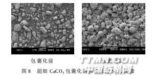 从图6、7可看出,包囊化CaCO3粉体在水体系中 的分散稳定性随时间的变化不明显,反映出体系一直 处于一种很好的稳定状态.2.3包囊化前后超细CaCO3的形貌分析由图8可以看到,原料CaCO3颗粒表面既不透明 也很粗糙,而包囊化后的样品表面上有一层薄薄的半 透明膜,而且表面比原料CaCO3颗粒表面光滑,说明通过原位乳液共聚包覆后,在CaCO3颗粒表面确实有 聚合物存在.