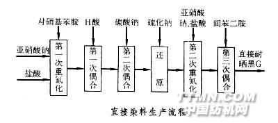 钠,调节溶液呈碱性,使对硝基苯胺重氮盐在H酸羟基的邻位上进行第二次偶合,便得到双偶氮染料。用硫化钠使硝基还原成氨基,酸析过滤,滤饼溶解在碳酸钠溶液中,再加入亚硝酸钠,随即加到盐酸冰水溶液中去,用反加法进行第二次重氮化,生成的重氮盐,再与间苯二胺进行第三次偶合,可得直接耐晒黑G(C.I.直接黑19)染料。