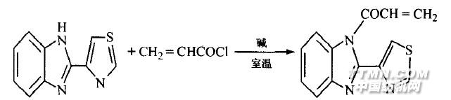 2 结果与讨论2.1 溶剂的选择噻苯咪唑为固体粉末、丙烯酰氯为液体,要使噻苯眯唑能与丙烯酰氯充分反应,应使反应在液相中均相进行,因此溶剂的选择是关键。从TBZ及丙烯酰氯的结构和性质判断,选用了非水溶剂,因丙烯酰氯极易水解并聚合。首先,分别取噻苯咪唑1.0 g,分别加入1 mL二甲基亚砜、四氢呋喃、甲苯、氯仿、丙酮在二甲亚砜及四氢呋喃中噻苯眯唑完全溶解,在甲苯中部分溶解,在丙酮中、苯中、氯仿中几乎不溶。考虑丙烯酰氯会与二甲基亚砜剧烈反应。本实验选用四氢呋喃,使反应在均相中进行,反应较完全。2.2 温度的影响目标化合物的合成过程中,实践表明滴加速度过快,反应剧烈放出大量的热使产品聚合而降低产率,且温度偏高反应太快,易生成二酰化产物。TLC检测表明杂质较多,因此,加料温度不能太高,最好控制在0~5℃ 下慢慢滴加丙烯酰氯,然后室温反应。