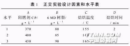 (纺织、纺织产品通用部分)》测试。2 3 整理工艺流程织物→浸轧(含阻燃剂CP、6MD树脂、催化剂、柔软剂、渗透剂、尿素、磷酸的整理液,pH4 5~5 4;室温二浸二轧,轧余率为(85%)→烘燥(3min)→焙烘→水洗→烘干→冷却。水洗后整理浴的pH值大约为8左右。2 4 正交试验设计本实验确定棉织物阻燃剂CP、6MD树脂、焙烘温度和焙烘时间为正交试验的主要因素,探讨其对棉织物阻燃性能的影响。为此,设计了4因素3水平L9(34)的正交试验设计,因素和水平见表1。