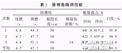 3 结果与讨论3 .1 原布性能为更好地比较原布和处理后织物的各项性能,对原布的阻燃性能、极限氧指数、断裂强力和白度进行了测试,具体数据见表2。