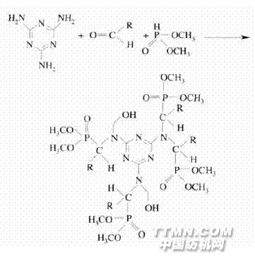 织物吸湿性强、透气性好、无静电、穿着舒适等,深受人们青睐.但棉织物属易燃织物[1],因此,对其进行阻燃整理已成为关注公众生命和社会安全的时代性课题.[2-3]含卤素阻燃剂因环保问题现已逐渐退出市场[4-5],目前,经常使用的含磷氮阻燃剂有四羟基氯化膦系列(如THPC)、N-羟甲基磷酰胺类(如亨斯迈PyrovatexCPconc.,国产CFR-201、FRC-2等)及环状膦酸酯类等品种,但市场上常用的耐洗性全棉阻燃剂仅有PyrovatexCP和THPC两种.[6-7]PyrovatexCP需使用大量含游离甲醛的交联剂[8-10],而THPC的P—C键键能低,易释放出甲醛[11-12],为此,开发新型低甲醛阻燃剂或研究新的应用工艺显得尤为重要.1·实验1.1材料及设备材料:28×60斜纹纯棉纱卡.药品:三聚氰胺、柔软剂、精练渗透剂等为工业品,六水合氯化镁等为化学试剂.仪器:YG(B)815D-I型垂直法织物阻燃性能测试仪(温州大荣纺织仪器有限公司),JF-3型氧指数测定仪(南京市江宁区分析仪器厂),SHIRLEY型弹性折皱回复测试仪(美国SDL公司),H10K-S型双臂万能材料试验机(美国TiniiusOlsen公司),Datacolor650型电脑测色配色仪(美国Datacolor公司),SDT2960型DSC-TG热分析仪(美国TAInstruments).1.2阻燃剂的合成将一定量三聚氰胺、醛类、亚磷酸二甲酯、无水乙醇加入到带有搅拌器、温度计、回流冷凝管的四口烧瓶中,室温搅拌20min后,加热至55~60℃,用三乙胺调节pH值为6~7,保温反应并进行浊度测定.当浊度为30℃时停止加热,迅速冷却到室温,加入一定量异丁醇,即得阻燃剂.反应式如下: