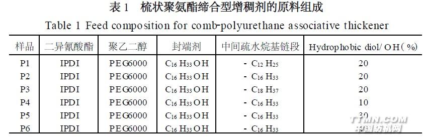 2. 3 梳状聚氨酯缔合型增稠剂的合成将计量的聚乙二醇(PEG) 和无水甲苯投入到带机械搅拌、分水器(含冷凝管) 和N2 入口的三口烧瓶中, 在N2 保护下甲苯共沸脱水, 之后降温至70 ℃,滴加少量二月桂酸二丁基锡和化学计量比的异佛尔酮二异氰酸酯( IPDI) 的无水甲苯溶液并反应1. 5h ,待预聚反应完成(用二正丁胺2甲苯法跟踪反应的进程,下同) 。升温至80 ℃,再加入一定比例(即疏水性二醇/ 总羟值) 的疏水性二醇进行扩链反应2h ,最后在加入长链烷基醇进行封端反应2h ,待聚合反应完成,再用低沸点石油醚沉淀、洗涤反应产物,抽滤之后,于50 ℃下真空干燥,得白色颗粒状固体,即梳状聚氨酯缔合型增稠剂。表1 列出了梳状聚氨酯缔合型增稠剂的原料组成。图2 列出了疏状聚氨酯缔合型增稠剂的合成路线。.jpg)