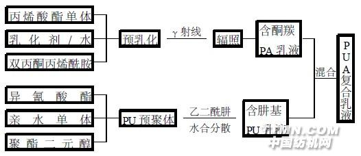 源) ,约7、4 ×10的14次方Bq。1. 2 合成工艺1. 2. 1 含有活性酮羰基PA 乳液的制备将丙烯酸酯混合单体和平平加O ,按比例搅拌制成预乳液,投入辐照罐内搅拌,按辐照剂量要求将辐照罐置于辐照场内一定位置, 通氮气5 min ,除去预乳液中的氧,升钴源辐射引发,辐射剂量2、0 kGy ,辐照时间约60 min ,即制备出含有活性酮羰基的PA 乳液。1. 2. 2 肼基封端PU乳液的制备首先合成端基为异氰酸酯基团,分子链含亲水基团的PU 预聚体,再将PU 预聚体中和制备出PU离聚体,在水合分散的同时加入适量的ADH 单体,制备出含肼基的PU 乳液[4 - 5 ] 。1. 2. 3 酮肼交联型PUA 复合乳液的制备取已制备的含有活性酮羰基的PA 乳液和肼基封端的PU 乳液按照一定的酮肼基物质的量比混合均匀,调节pH 值至7~7、5 ,即制备出稳定的酮肼交联型PUA 复合乳液。工艺路线如下: