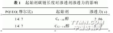由表1可以看出,当PO EO加成摩尔比相同时,起始剂为C8~10醇的嵌段聚醚渗透