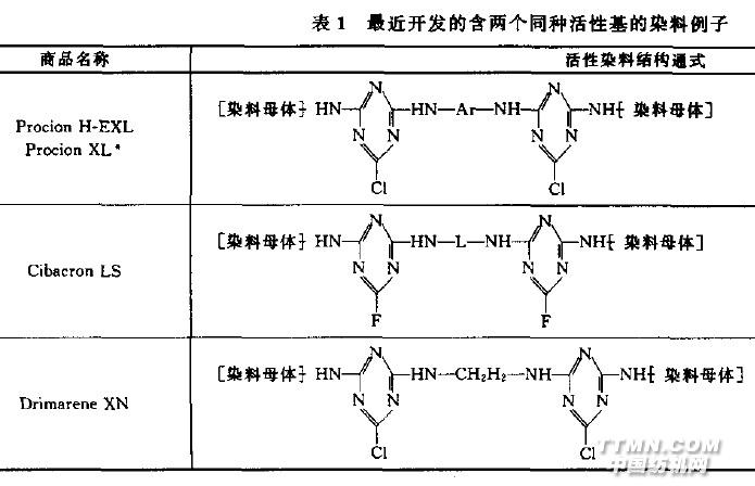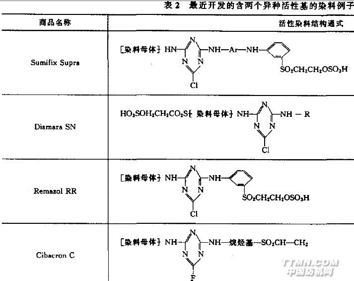 除了双活性基染料外,也研究多于两个活性荃的染料,虽然从理论上分析它们应当得到更高的固着率,但由于多个活性墓的染料会产生移染.不仅影响了染料的固着,