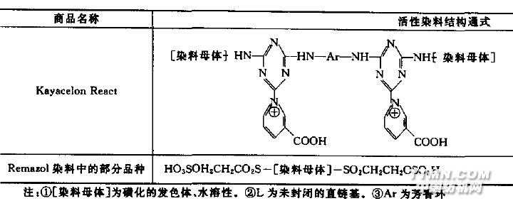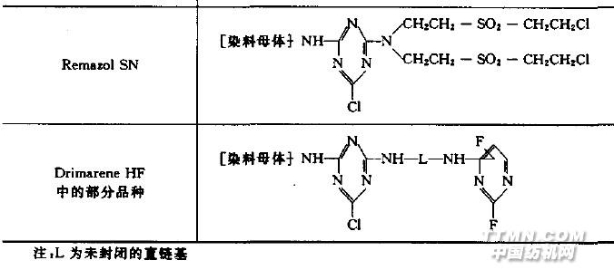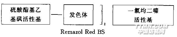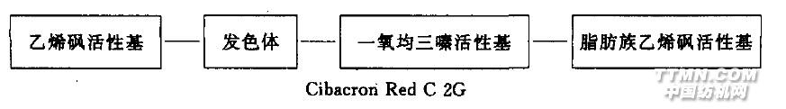 特别在用较深的色度染色时,而且染料的提升力也受到不利的影响.当然市场上也有极个别性能较好的含有三个活性基的结构较复杂的染料.如Cibacron Red C-2G和Remazol Red BS,它们的结构示意如下: