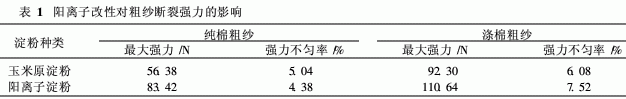 纱,其断裂强力明显好于用玉米原淀粉浸浆的粗纱。这是由于在淀粉大分子链上引入了带正电荷的阳离子基团,这些基团能够与带负电荷的纤维在其界面形成静电层,从而增强淀粉浆液与纤维之间的界面作用力。另外,阳离子淀粉分子链上的阳离子基团还能够与水分子进行氢键缔合有利于阳离子淀粉浆液润湿和铺展到纤维表面,使两者之间的黏附力显著提高。