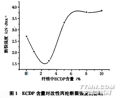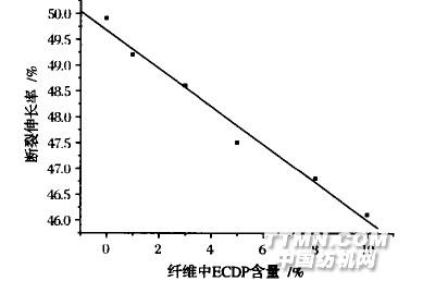 从图1中可以看出:改性丙纶断裂强度先随ECDP添加量的增加而下降,后随ECDP添加量增加而增加。ECDP对改性丙纶断裂强度的影响有两方面:一方面,ECDP的加入导致改性丙纶结构不均匀,降低其断裂强度;另一方面,ECDP自身的强度比聚丙烯大,ECDP的加入可使改性丙纶增强。当ECDP含量较少时,增强效果不明显,反而会使共混体系结构不均匀而导致改性丙纶断裂强度下降。当ECDP含量较多时,ECDP增强起主导作用,此时,随着ECDP的加入,改性丙纶断裂强度增加。图2中的曲线表明了ECDP的添加量与纤维断裂伸长率之间的关系。由图可见,纯丙纶(ECDP含量为0)的断裂伸长率最大,此后随着ECDP含量的增多,改性丙纶断裂伸长率下降。这是因为聚丙烯为柔性大分子,而ECDP为刚性链,两者相容性差,在PP中添加ECDP后,使共混纤维结构不均匀,而导致其伸长率下降[2]。
