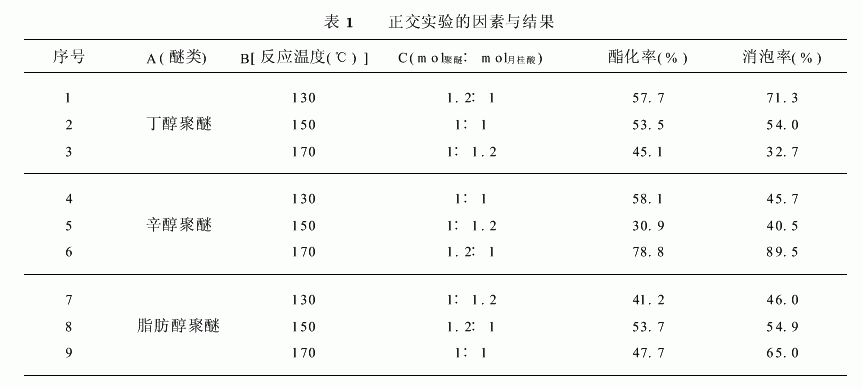 1 实验1.1 仪器与试剂550型FTIR红外光谱仪(KBr压片)。月桂酸、氢氧化钾、氯化钠等均为化学纯,95%乙醇为分析纯,丁醇聚醚、辛醇聚醚和脂肪醇聚醚由南京金陵石化德赛化工有限公司提供。1.2 酯醚型消泡剂的合成称取聚醚20g(21.6mmol)于三颈瓶中,并加入对甲基苯磺酸0.3g(即体系0.9wt%左右)作为催化剂,搅拌加热直至催化剂完全溶解,取0.5g左右试样测空白酸值(以计算反应的酯化率),然后加入月桂酸3.5g(18mmol),继续加热至其完全溶解,取0.5g试样测起始酸值,搅拌下升温至160℃左右,每隔1h测一次酸值,直至酯化率几乎不变时停止加热,降温至60℃后用氢氧化钾水溶液(约5%左右)中和至pH=7,加入饱和氯化钠溶液萃取,除去盐类杂质。1.3 酸值的测定加入酚酞指示剂1滴~2滴于所测试样中,用KOH-乙醇溶液滴定至溶液变为红色为止,利用下式计算酸值:酸值=A×C×56.1/wA:KOH-乙醇溶液的用量(mL);C:KOH-乙醇溶液的浓度(moL/L);w:试样量(g)1.4 酯化率的计算酯化率= [(起始酸值-空白酸值)-反应后酸值]/(起始酸值-空白酸值)×100%1.5 消泡率的测定在100mL具塞量筒中加入起泡液(十二烷基硫酸钠2g和自来水20mL),室温下振荡30次后加入1%消泡液1g,记录起始泡沫体积和300s时的泡沫体积。其计算公式为:η=(A-B)/A×100%η:消泡率;A:空白时泡沫体积;B:300s时泡沫体积2 结果与讨论2.1 正交实验的结果及极差分析在酯化反应中,影响酯化率的因素有醚类(A),酯化温度(B),反应物摩尔比(C),催化剂用量等。先确定催化剂用量为体系的0.9%,其余三个因素均设3个水平。选用正交表L9(3)进行实验,结果见表1。