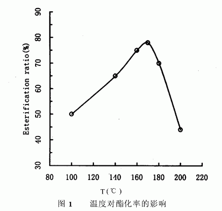 2.3 反应物摩尔比对酯化率的影响固定反应温度160℃,改变mol聚醚∶mol月桂酸,其余条件同2,实验结果如图2。由图2可知,聚醚与月桂酸的摩尔比在1.2左左酯化率最高,即醇稍过量,这符合酯化反应的一般规律。
