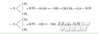 水性墨的染料或颜料分子中通常含有-SO3H、-OH等基团,而主体胶分子带有的氮丙环可与这些基团发生反应,生成不溶于水的物质。反应机理如下:
