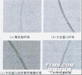 1 试验部分1.1仪器与试剂仪器 Motic B I型生物显微镜,Spectrum One型傅里叶红外吸收光谱仪(美国PE公司),哈氏切片器,玛瑙研钵、镊子和制片器等辅助工具。试剂 石蜡油,硫酸,盐酸,硝酸,氢氧化钠,甲酸,冰乙酸,丙酮,二甲基甲酰胺(DMF)等均为分析纯;次氯酸钠(化学纯);溴化钾(光谱纯)。1.2样品聚乳酸纤维、大豆蛋白纤维、牛奶蛋白改性聚丙烯腈纤维和甲壳素纤维的试样均来源于工厂原料。1.3样品前处理将试样平铺于试验台上,用镊子在不同部位等量镊取约200 mg纤维。1.4检测方法1.4.1显微镜观察法依据FZ/T 01057.3-2007《纺织纤维鉴别试验方法-显微镜观察法》,每个试样都整理成束,从中等量抽取一小束纤维平行置于载玻片上,加上少量液体石蜡,盖上盖玻片。将制成的纤维纵向切片,放在Motic B1型生物显微镜的载物台上,观察纤维的纵向形态,与标准照片或标准资料对比。得到各种纤维的纵向形态图,见图1。1.4.2溶解法依据FZ/T 01057.4-2007《纺织纤维鉴别试验方法一溶解法》,将100 mg纤维试样置于25 mL烧杯中,注入10 mL溶剂,在常温下用玻璃棒搅动5 min(试样与试剂的用量比为1:100),观察溶剂对纤维的溶解情况。但对有些在常温中难溶解的纤维,需要加温作沸腾试验,用玻璃棒搅动3 min,观察其