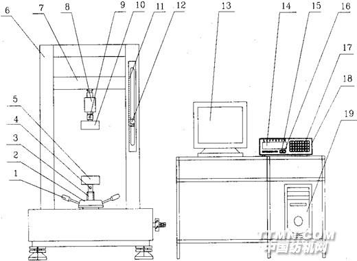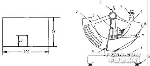 图11—5 织物落锤式撕裂试验机1—指针调整螺钉 2—运动试样夹钳 3—扇形锤 4—固定试样夹钳 5—切刀6—切刀手柄 7—起动扳手 8—扇形铁挡板 9—指针 10—底角螺丝3.顶破强度 顶破是织物破坏的一种形式。它是将一定面积的织物周围固定,从织物的一面给以垂直的力使其破坏,称为顶破,也称为顶裂。顶裂和服装的膝部和肘部,针织物的手套和袜子等受力情况近似。由于机织物和针织物在强度和变形方面是一种各向异性的物体,在顶力作用下各向伸长,沿经、纬(或直、横)两方向张力复合的剪应力,首先在变形最大、强度最弱的一点上使纱线断裂,接着沿经向或纬向(直向或横向)撕裂,因而裂口一般呈直角形或直线形。由同种纤维组成经纬纱的织物,一般表现为:织缩率大而经纬向织缩率接近,则织物的顶破强度较高。这是由于经、纬纱对顶裂强度同时发挥作用的缘故,其裂口形状常为三角形。若经纬向纱线的变形能力不同或织缩率相差大时,则变形能力小的或织缩率低时一个系统纱线在顶裂过程中首先到达断裂伸长而告破裂,裂口常为一直线,这是由于经纬向纱线没有同时发挥最大作用,而顶裂强度较低;若经纬向纱线相同,经纬向密度差异大时,裂口也呈一直线。针织物的顶裂过程是组成试样的各线圈如钩接强度试验一样联成一片,共同承受伸长变形,直至顶裂为止。可以推知,如果组成针织物纱线的钩接强度越大,则顶裂强度也越大。针织物的顶裂强度可通过改用较粗纱线号数与适当提高针织物的针圈密度来提高,也可用各种合成纤维混纺来提高。利用织物顶裂强力试验机来测定织物的顶裂强力,通过