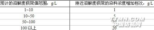 1.方法原理 在指定温度下,制备一组包括溶解度极限在内的已知浓度的待测染料溶液,然后在该温度下,采用可加热的布氏漏斗,用滤纸对溶液进行抽滤,并通过目测滤纸的残渣和测量过滤时间来确定溶解度的极限。2.仪器和试剂(1)加热浴、电磁搅拌器、布氏漏斗、广口锥形烧瓶、秒表。(2)水:符合GB/T6682—92中三级水的规定。3.检验步骤(1)溶液的制备所制备的染料溶液的浓度档次将按预计的该染料的溶解度极限值来选定。如表9-14所示。 表9-14 染料溶液的浓度选择