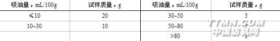 (2)将试样置于平板上,用滴定管滴加精制亚麻仁油,每次加油量不超过10滴,加完后用调刀压研,使油渗入受试样品,继续以此速度滴加至油和试样形成团块为止。从此时起,每加一滴后需用调刀充分研磨,当形成稠度均匀的膏状物,恰好不裂不碎,又能粘附在平板上时,即为终点。记录所耗油量,全部操作应在(20~25)min内完成。4.检验结果吸油量A以每100 g产品所需油的体积或质量表示,分别用式9-18或式9-19计算:A = 100V/m (9-18)A = 93V/m (9-19)式中: V— 所需油的体积,mL; m — 试样的质量,g; 93— 精制亚麻仁油的密度乘以100。 报告结果准确到每100g颜料所需油的体积或质量。
